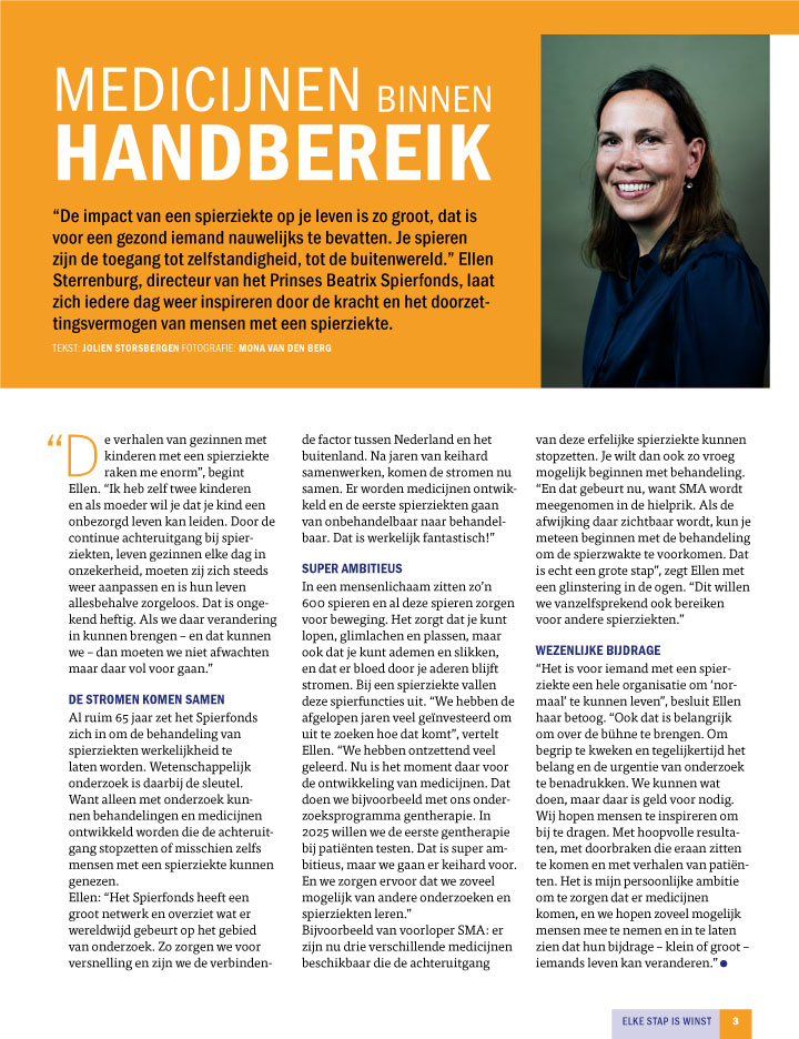 “De impact van een spierziekte op je leven is zo groot, dat is voor een gezond iemand nauwelijks te bevatten. Je spieren zijn de toegang tot zelfstandigheid, tot de buitenwereld.” Ellen Sterrenburg, directeur van het Prinses Beatrix Spierfonds, laat zich iedere dag weer inspireren door de kracht en het doorzettingsvermogen van mensen met een spierziekte. “Het is mijn persoonlijke ambitie om te zorgen dat er medicijnen komen, en voor de eerste spierziekten zijn die medicijnen binnen handbereik.”
